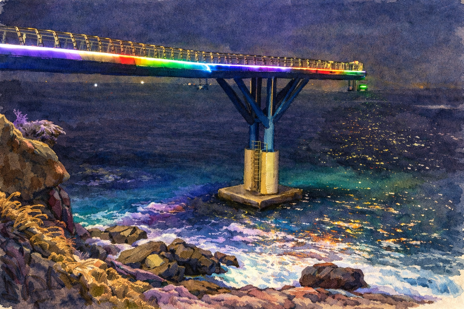 겨울밤의 조명과 바다 소리를
